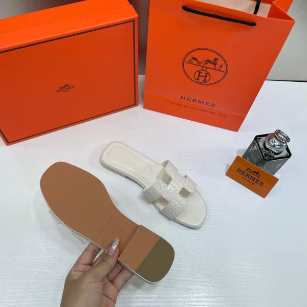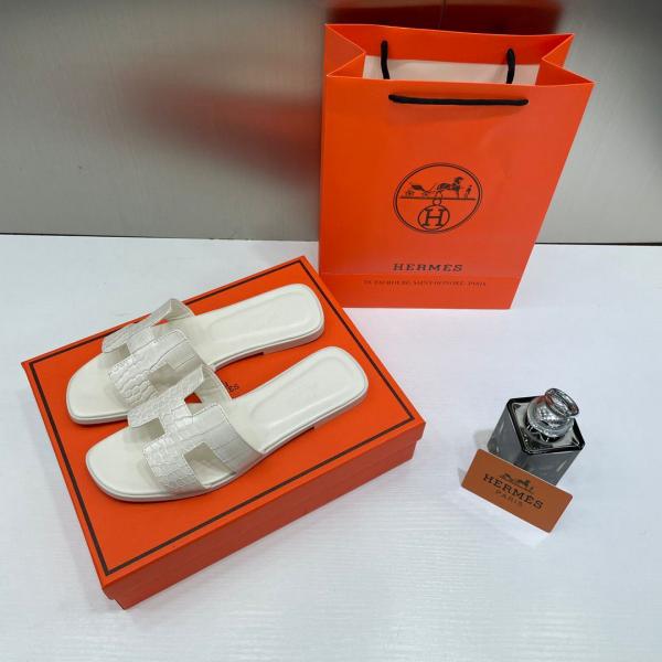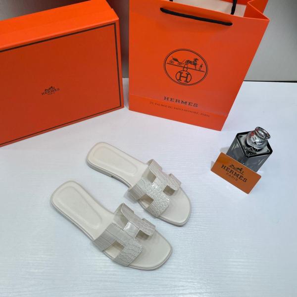 • Hermes Paris Oran Flats Croc Leather White For Her With OG Box & Carry Bag White Slide
